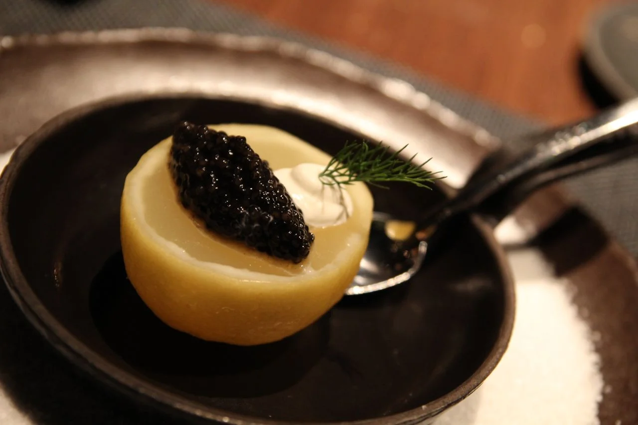 a gorgeous little half Meyer lemon rind filled with lemon gelee and topped with sustainable sturgeon caviar (hello delightful tie-in to New Brunswick!);